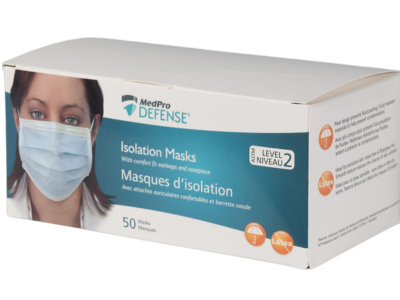 018-239: MedPro Defense isolation masks with earloops, Blue, ASTM Level 2, 50 masks per box, 40 boxes per case, sold per case;